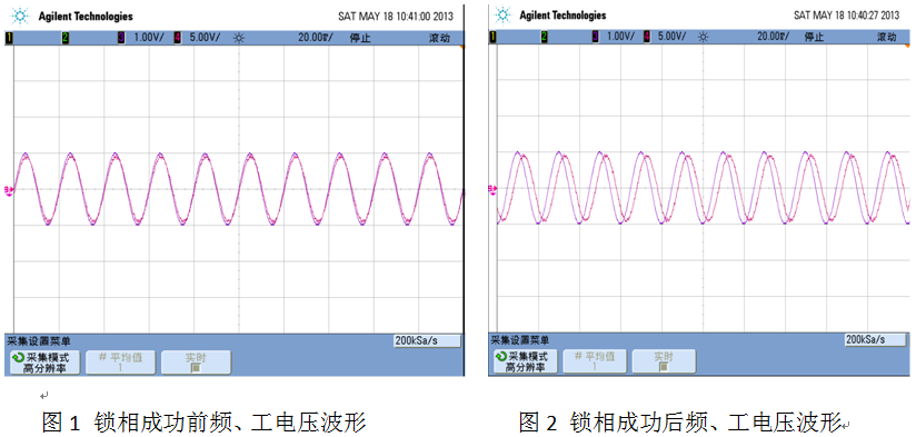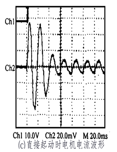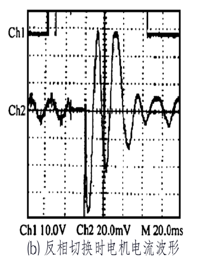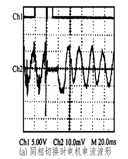 图(a) 为变频电源与工频电源相位相差3.6°切换时的电机电流波形, 前半段为变频电源驱动电动机 的电流波形,后面一段则为工频驱动电机的电流波形。从该图可以看出, 切换时的电流为电机稳态运行电流的1-2倍, 电流过渡平稳。