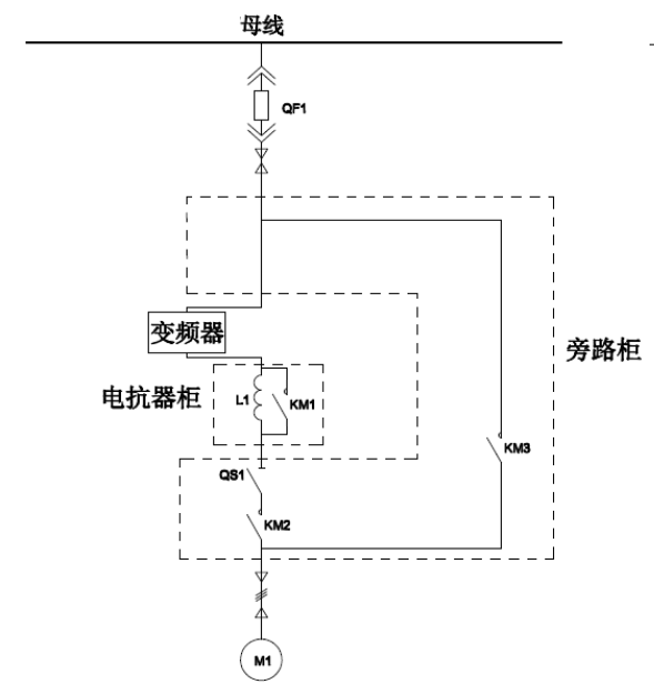 先由变频器拖动电机运行,当变频器的输出电压的频率、相位都与电网相一致是,将电动机瞬间切换到工频电网运行,同时将变频切除;